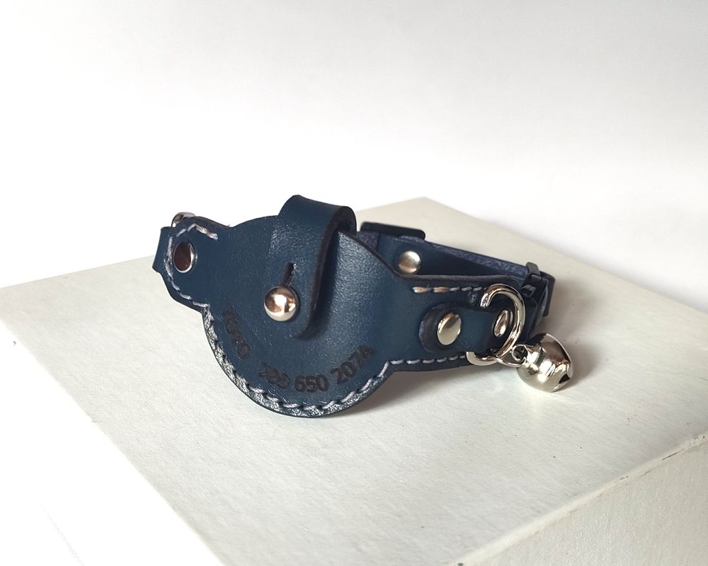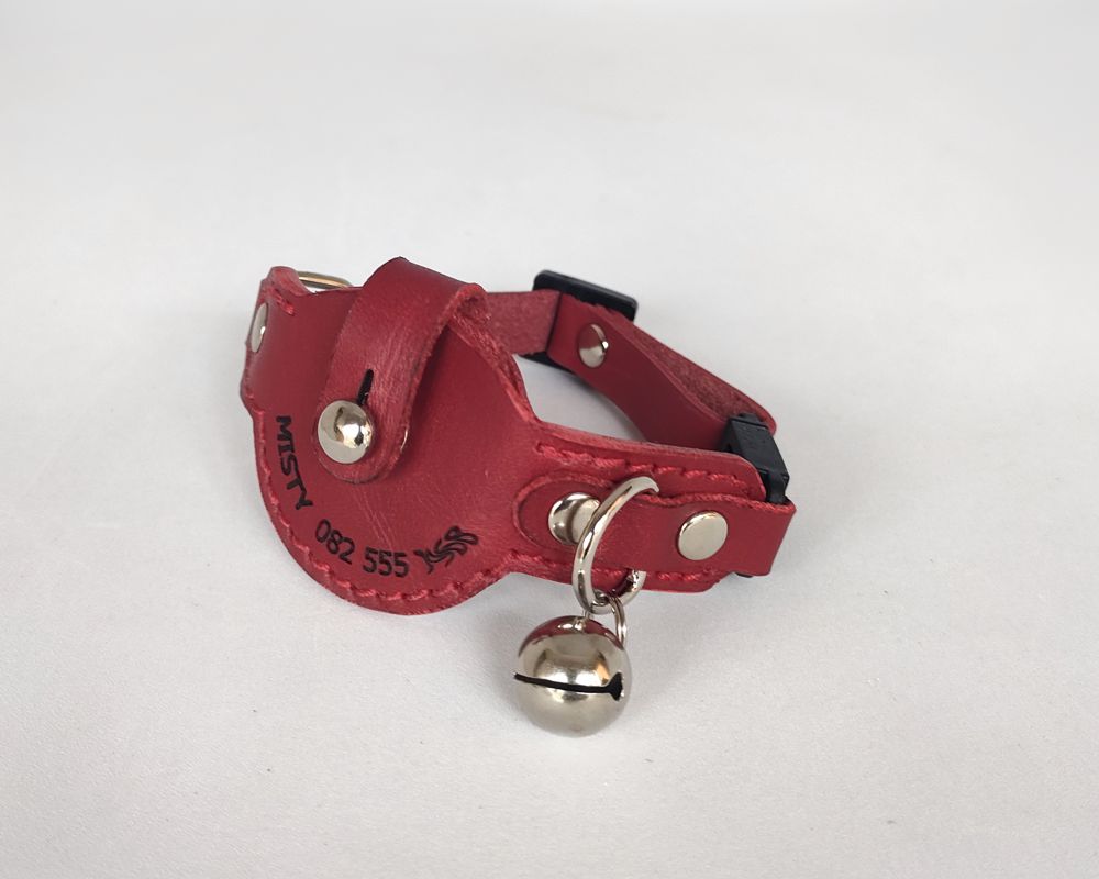 The collar is fitted with a safety breakaway buckle and detachable bell, but can also be made with a normal buckle if preferred (just leave a note when checking out).