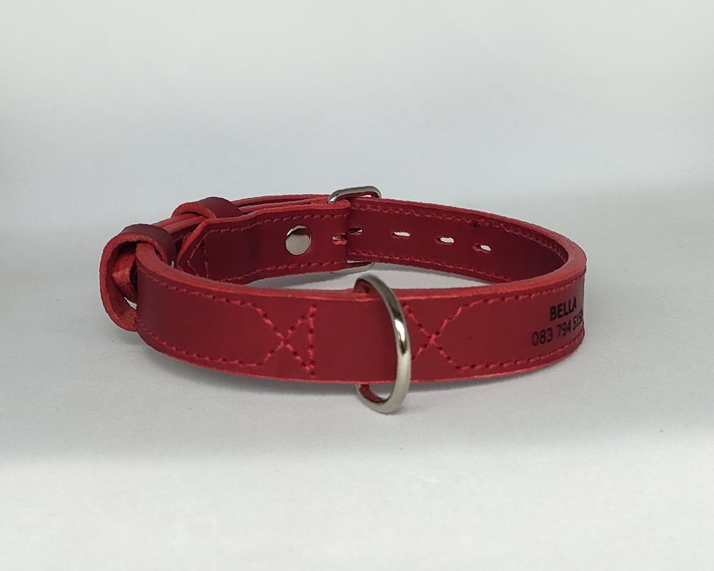 The collar is crafted from double-layered leather with detailed stitching, available in various colours and 19mm wide.