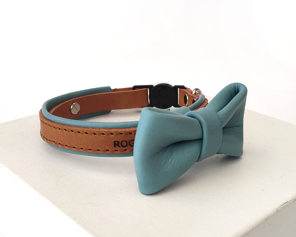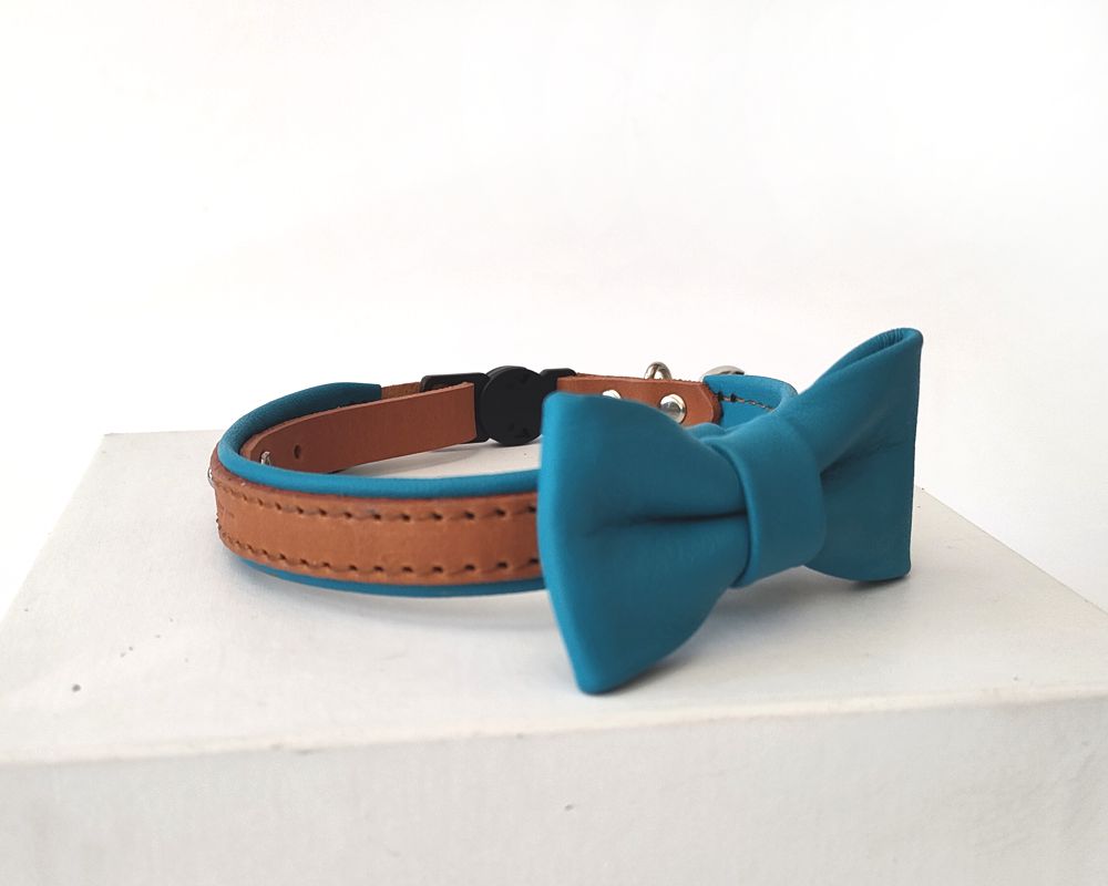 Bowties are detachable and fitted to the collar by means of a leather band and press stud.