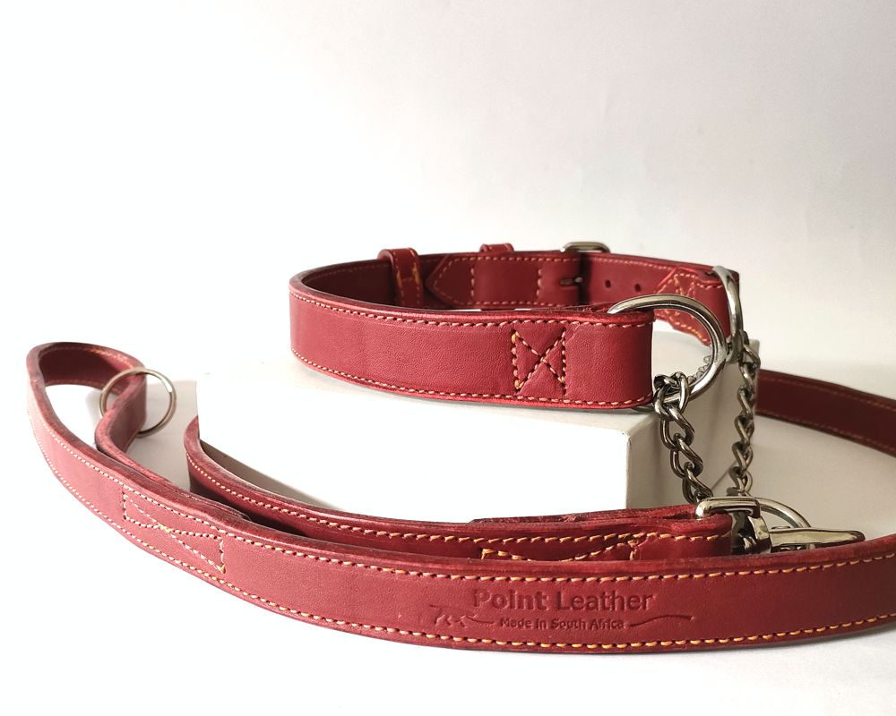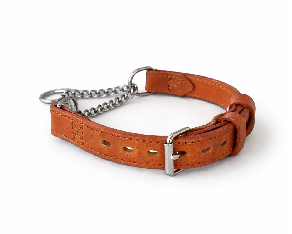 Adjustable martingale /half-check collar in double-layered leather with stitching detail.