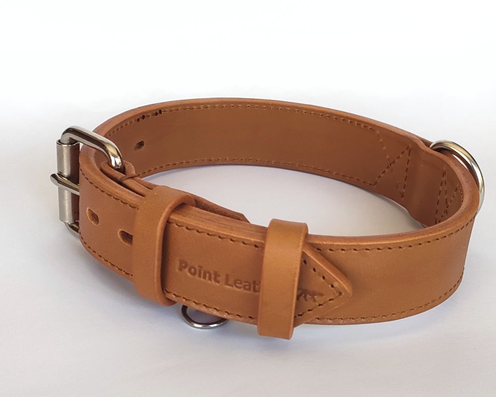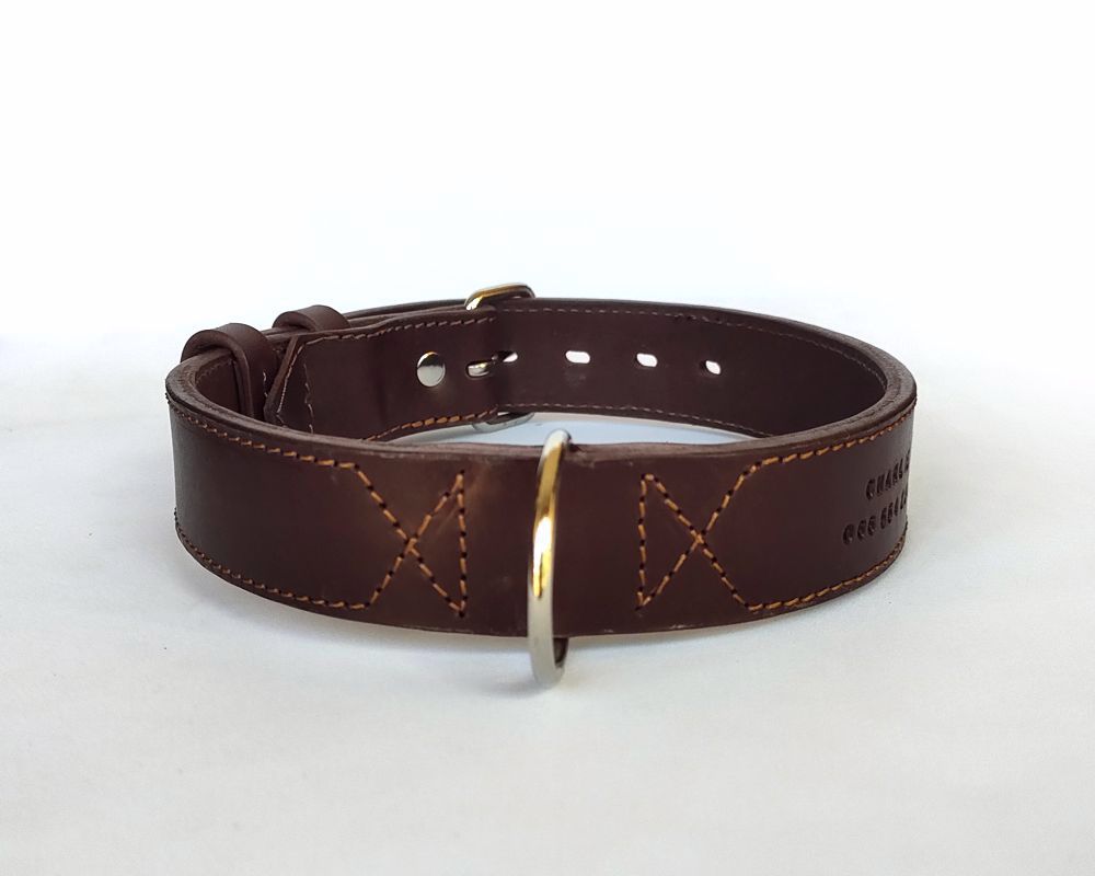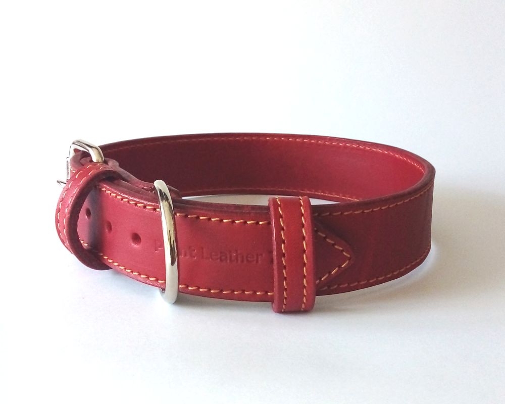 The collar is crafted from double-layered leather with detailed stitching, available in various colours and 32mm wide.