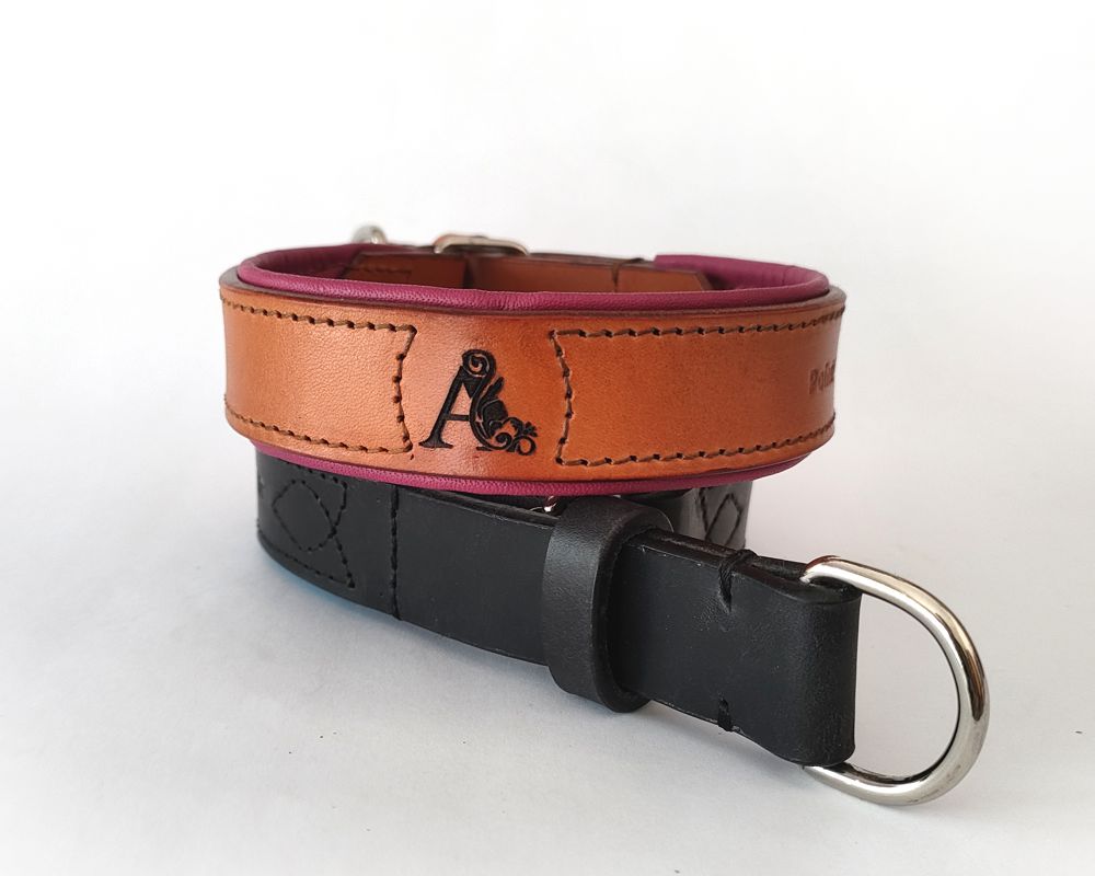 The collar is 25mm wide. It can be made in uniform width or tapered to 40mm at the widest point. It is easily customisable by adding studs or omitting the lining.